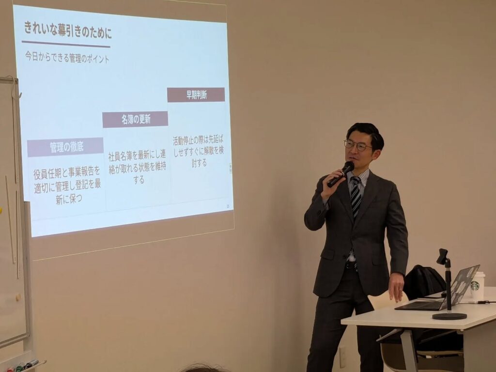 その一例として、川井さんからは役員改選時の登記や届出、年度の事業報告書の提出を忘れず行うこと、徳倉さんからは次の代表を育てるのに4年(役員任期でいうと2期分)は必要というお話がありました。